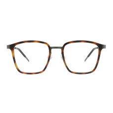 Solstice eyeglasses present a sharp square frame in a distinguished tortoiseshell pattern, designed for universal appeal for both genders.