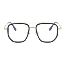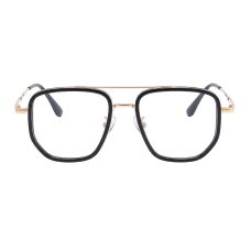 Apollo eyeglasses feature a distinctive square-aviator frame with a sleek black and gold finish, perfect for a bold, modern look for both genders.