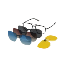 It includes a magnetic clip-on system with deep grey polarized, gradient blue polarized, tea polarized, and yellow night vision lenses, offering comprehensive UV protection and day-to-night adaptability.
