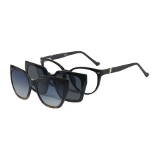 The elegant cat-eye frames are available in a basic black, featuring a clear-lens base for vision correction, which effortlessly transforms into chic sunglasses with magnetically attached tinted lenses.