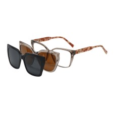 This base frame effortlessly transforms with magnetically attaching clip-on lenses. The set includes two sunglass options: one with classic dark grey tinted lenses for optimal sun protection, and another with warm brown tinted lenses, offering a stylish alternative.
