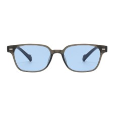 These glasses feature a distinctive translucent grey frame, beautifully contrasted with vibrant sky-blue tinted lenses that offer both a unique aesthetic and comfortable vision.
