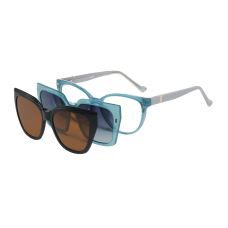 The elegant cat-eye frames are available in a vibrant turquoise blue, featuring a clear-lens base for vision correction, which effortlessly transforms into chic sunglasses with magnetically attached tinted lenses.